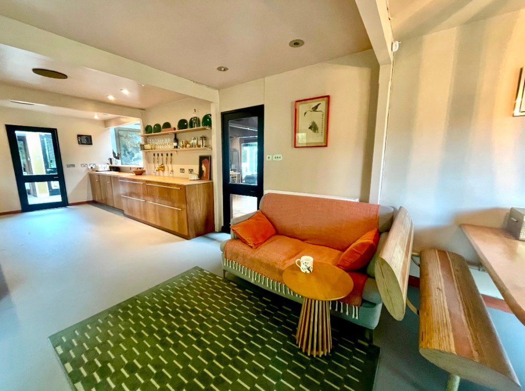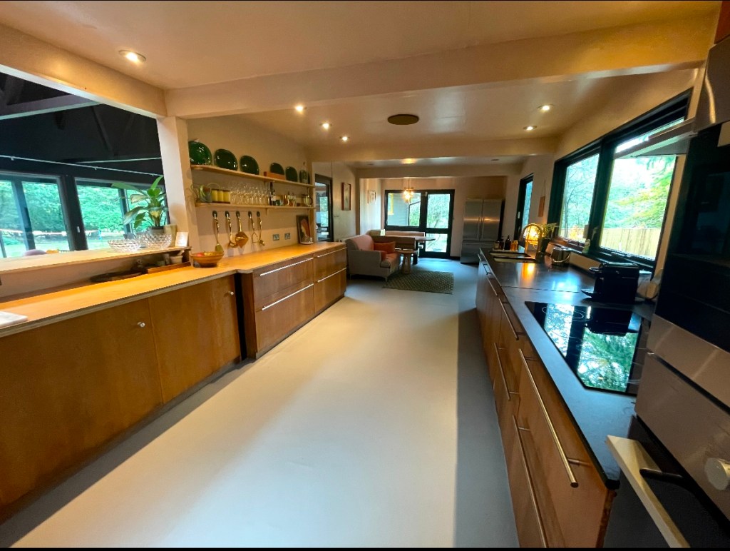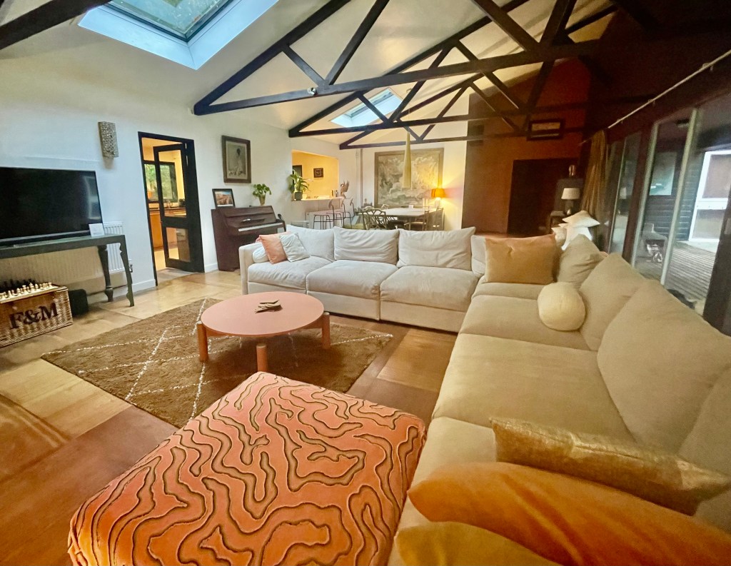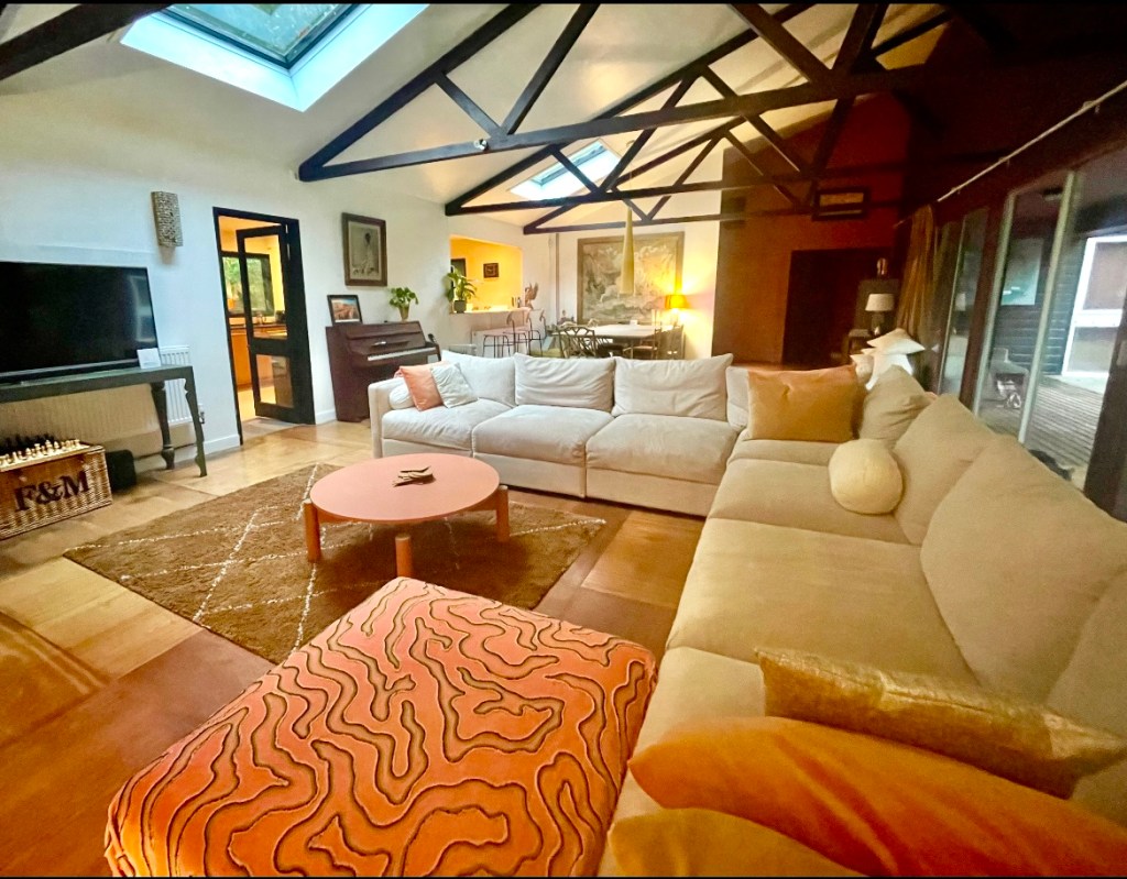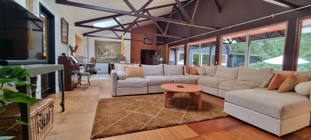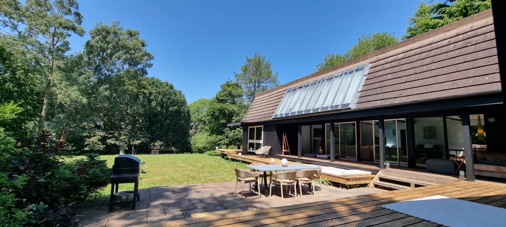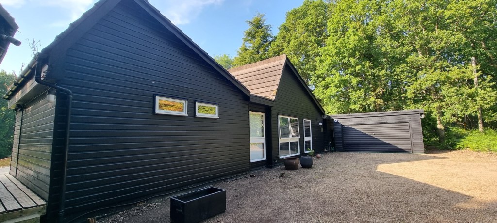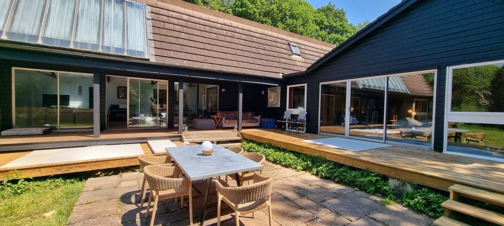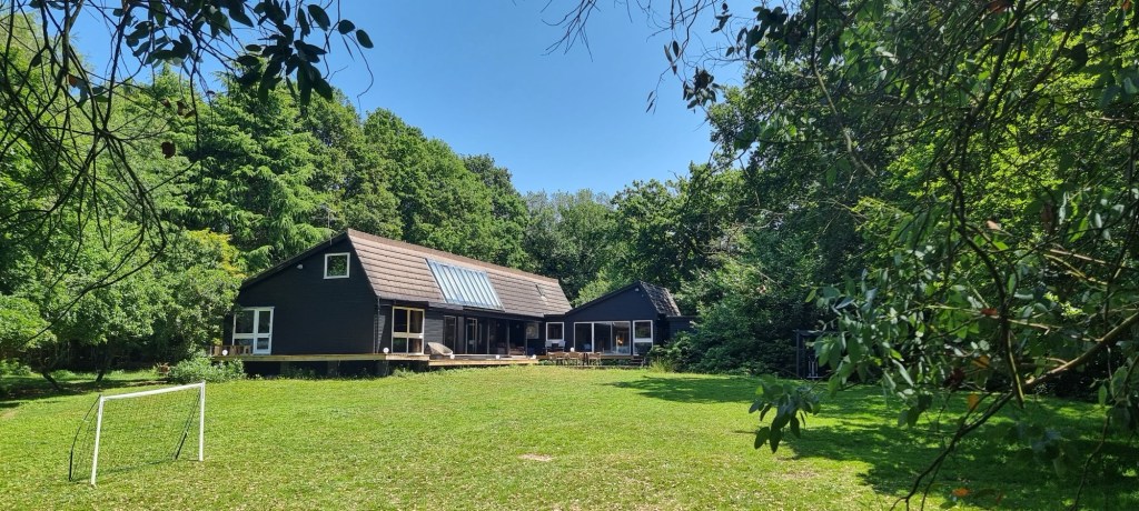 Coopersfield is a double height, single storey, black wooden house built in the 80’s by two artists. It was designed to maximise natural light and views of surrounding nature with floor to ceiling windows in many rooms, skylight pyramids and veluxes. It is approx 4,000 sq ft. More details below the photos…
