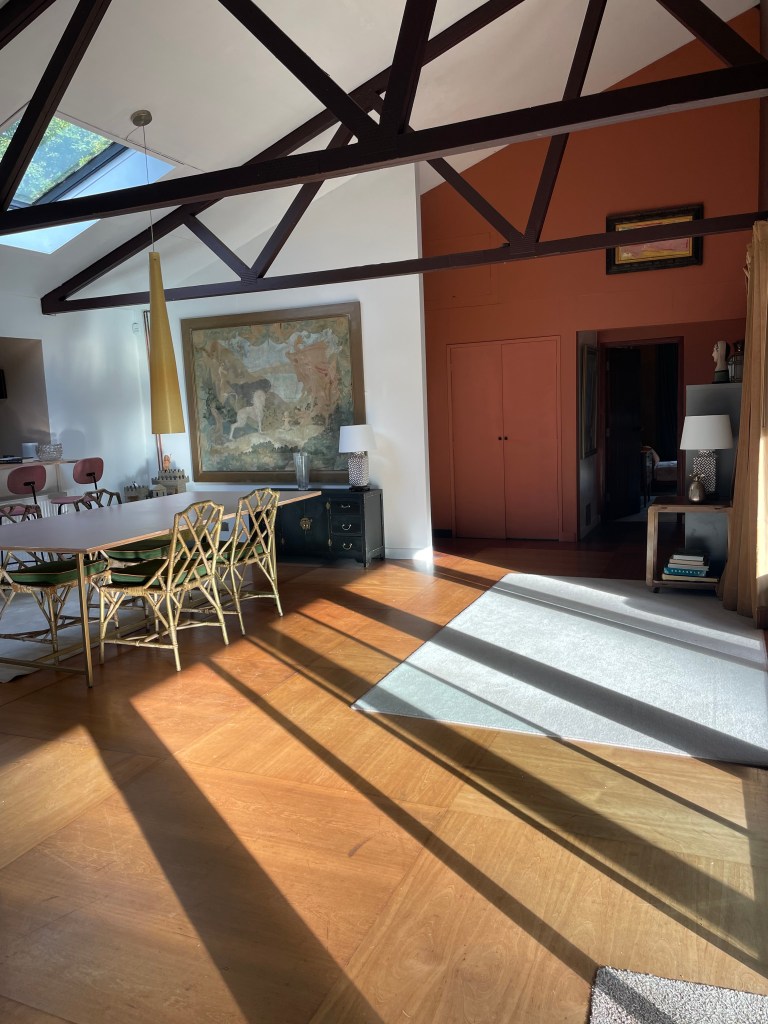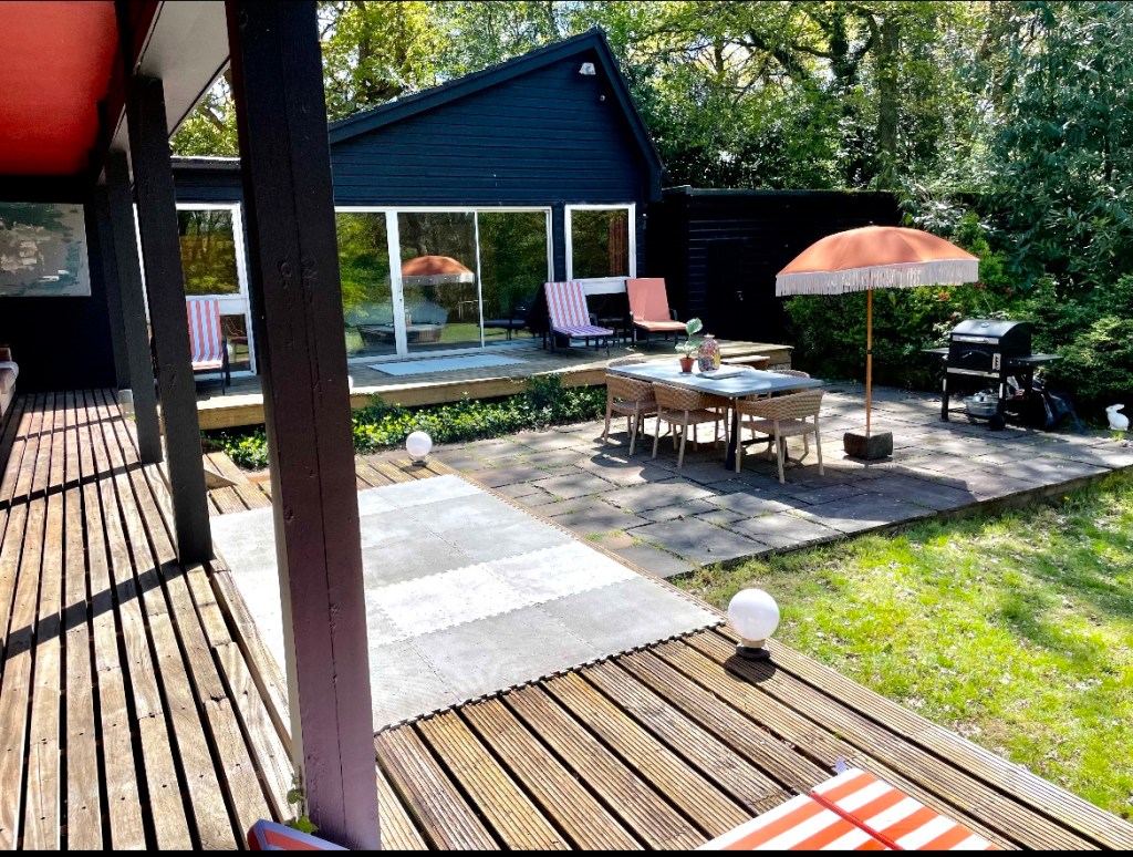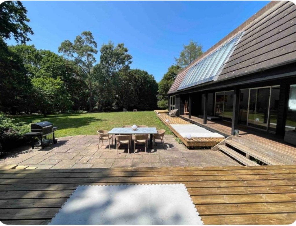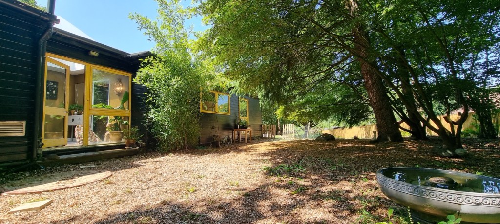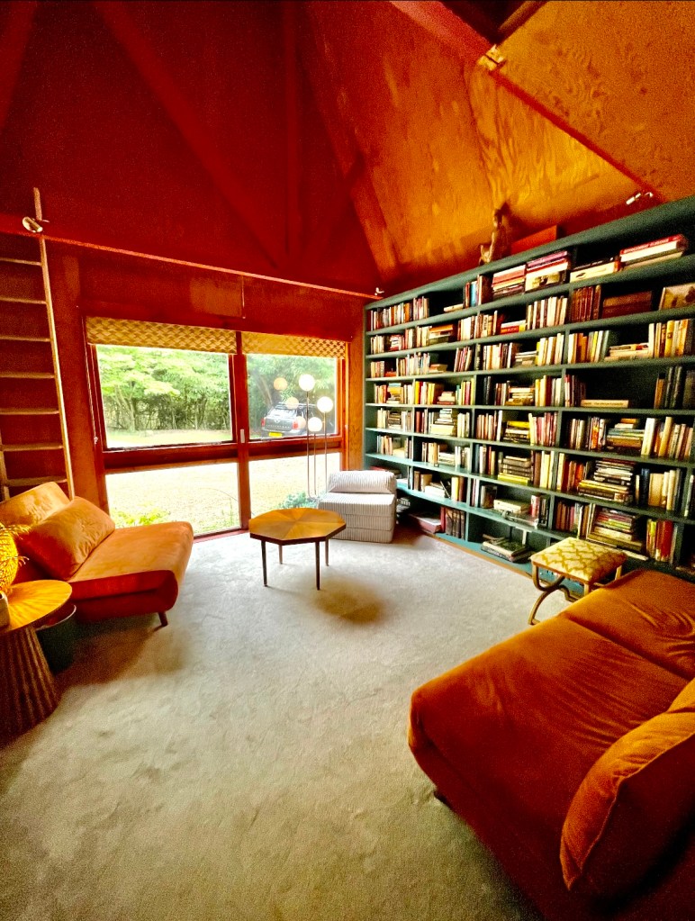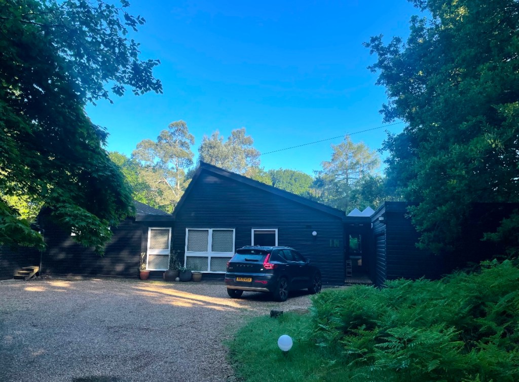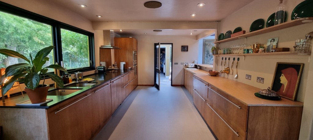 Coopersfield is a double height, single storey, black wooden house built in the 80’s by two artists. It was designed to maximise natural light and views of surrounding nature with floor to ceiling windows in many rooms, skylight pyramids and veluxes. It is approx 4,000 sq ft. More details below the photos…
