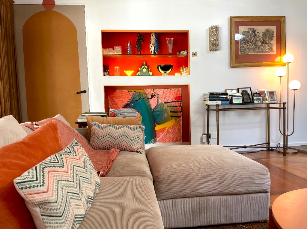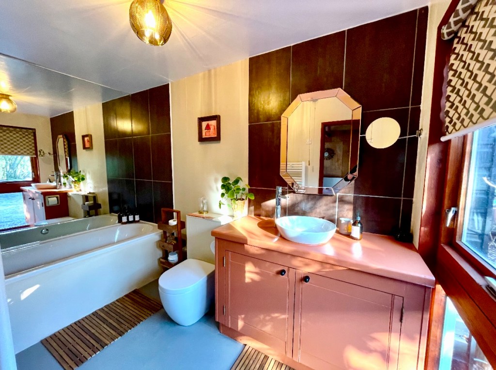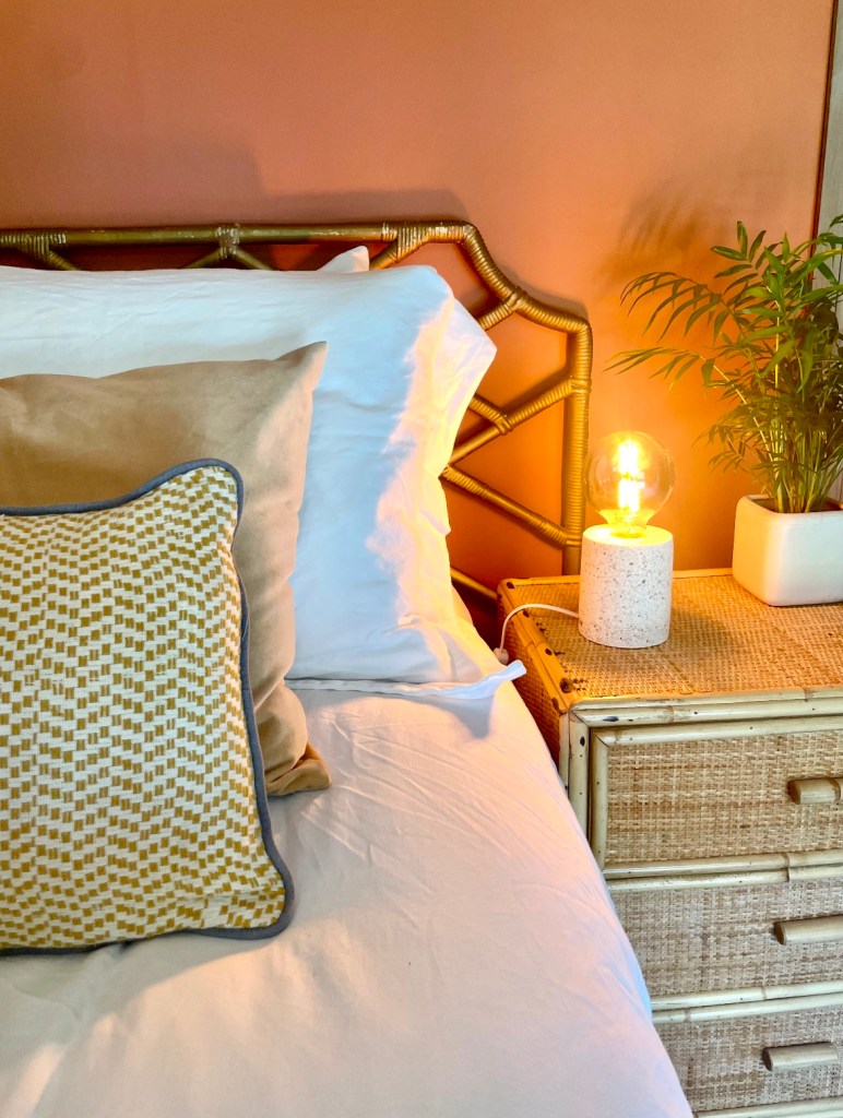 Interiors are light and airy, decorated in a warm contemporary palette of pinks, burnt oranges, mustards, white and green accents.