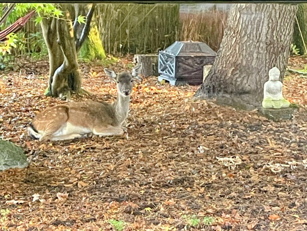 Unusual features include a large art studio, a long verandah with wrap-around terrace, an indoor sauna room, a breakfast bar that spans a kitchen and dining room with views over the gardens, deer surround property often if we are careful not to disturb, equally they will move away if not wanted in shots.
