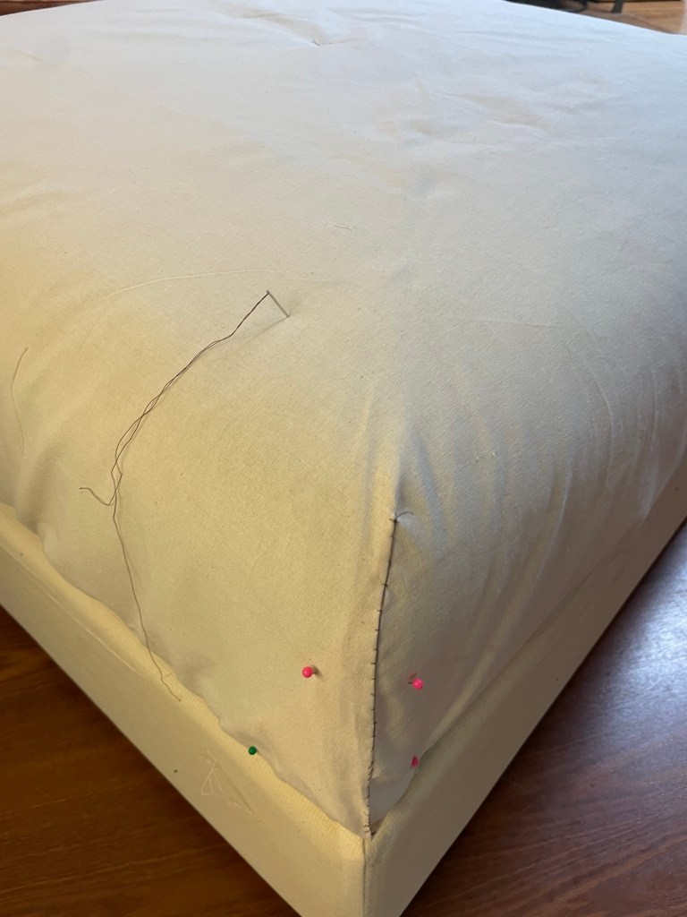 I ripped off the calico and ran up some fresh undercovers on the sewing machine. These allowed me to practice for the velvet covers which I’ll start soon 🥳